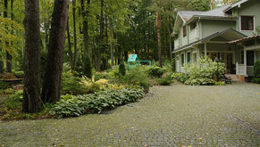 В проекте удалось расширить основную дорогу в приватную часть сада до двух с половиной – трех метров, что стало настоящей победой! Все мощения и дорожки выполнены из клинкера на бетонном основании. На верхней террасе – территория занятая газоном, ставшим красивым фоном для «большого» миксбордера, закрывающего всю западную и северную стороны владения от глаз соседей. В проекте озеленения сада несколько мощных групп ели обыкновенной вырастая, объединяются и выглядят, как одно громадное дерево – очень эффектный вариант посадки. Березы, букетные посадки клена Гиннала, многоствольные рябины и дуб красный «размывают» темную мощь елок, придавая саду гостеприимный и оптимистический вид. Яркое пятно из голубых елей колючих подчеркивается желтым облаком бузины красной Плюмоза Аурея и спиреи японской Голдфлэйм и Голдмаунд.